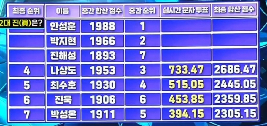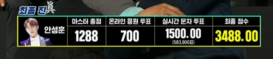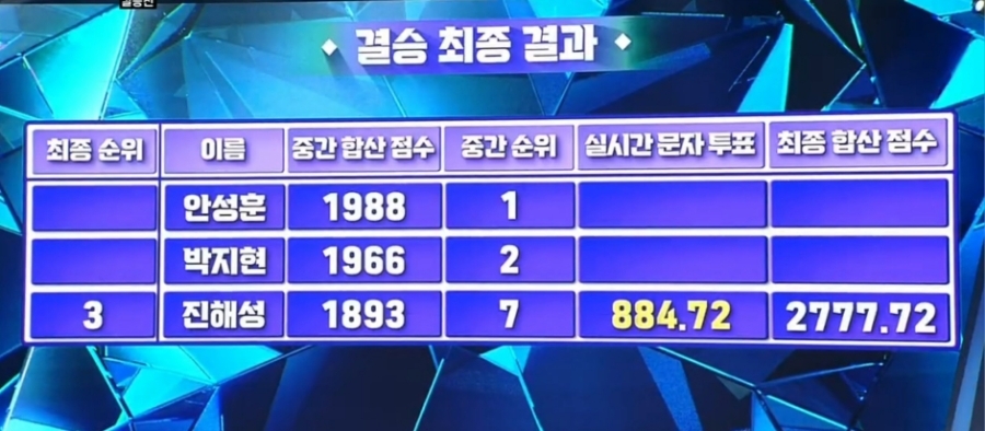 최종 우승인 '진'은 안성훈, '선'은 박지현, '미'는 진해성이 되었다.